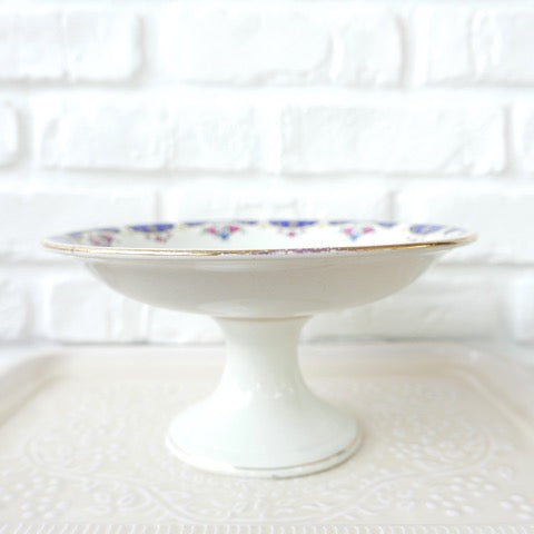 La coupe principale comme le pied sont réhaussées d’un filet doré qui s’accorde à merveille avec le décor dentelle et floral bleu et rose.