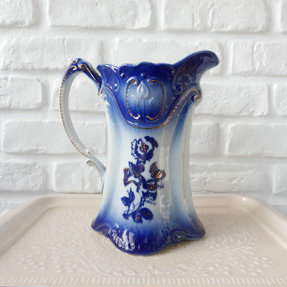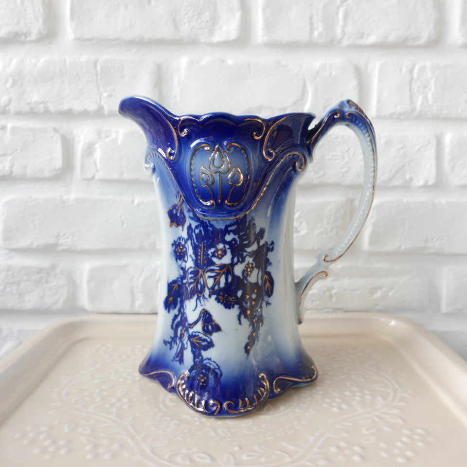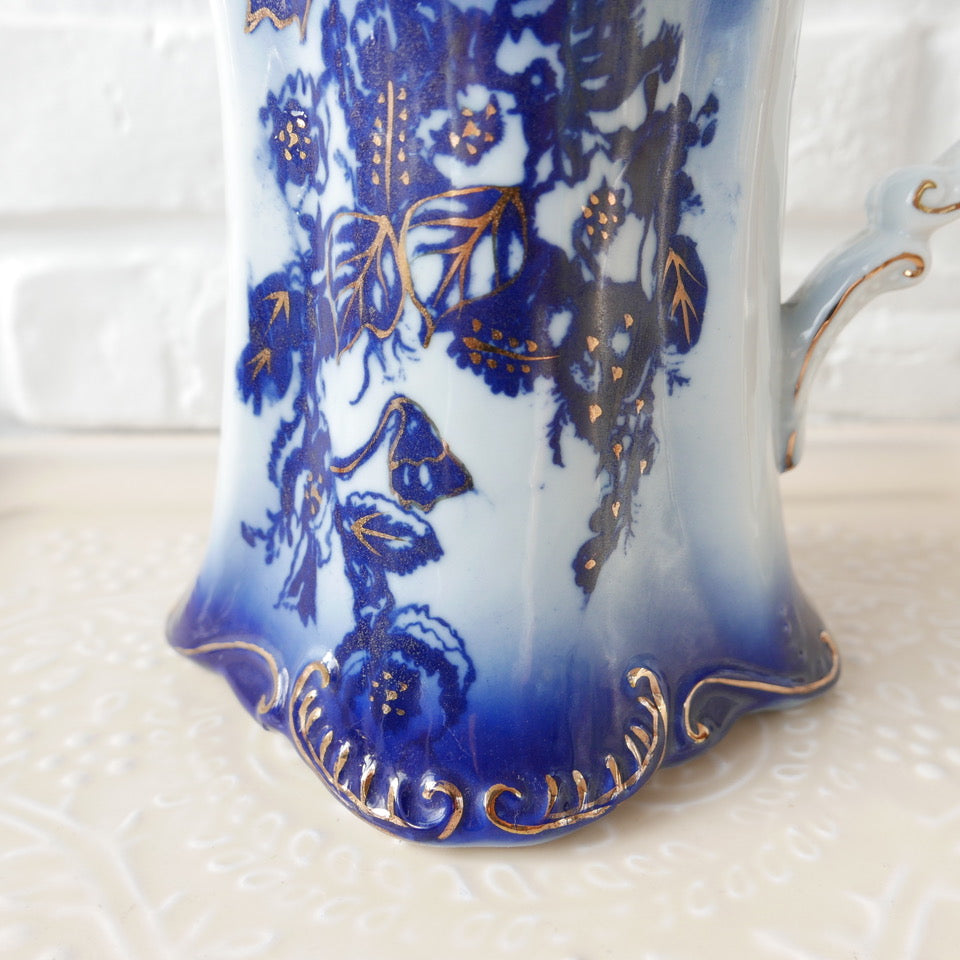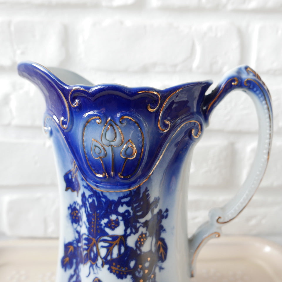 Ravissant grand pichet en barbotine de la Manufacture WWR&Co à Staffordshire, Angleterre, de style Art Nouveau, avec son décor floral et végétal moulé polychrome bleu vif et bleu pâle, aux couleurs de très belle intensité, réhaussé de dorures.