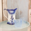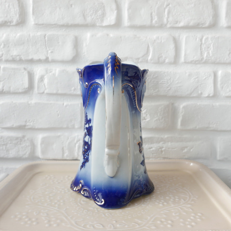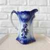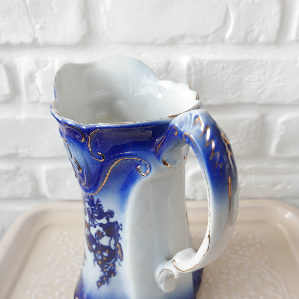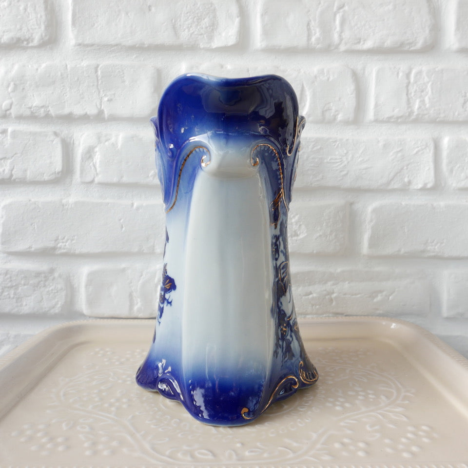 Ravissant grand pichet en barbotine de la Manufacture WWR&Co à Staffordshire, Angleterre, de style Art Nouveau, avec son décor floral et végétal moulé polychrome bleu vif et bleu pâle, aux couleurs de très belle intensité, réhaussé de dorures.