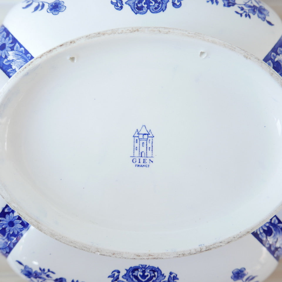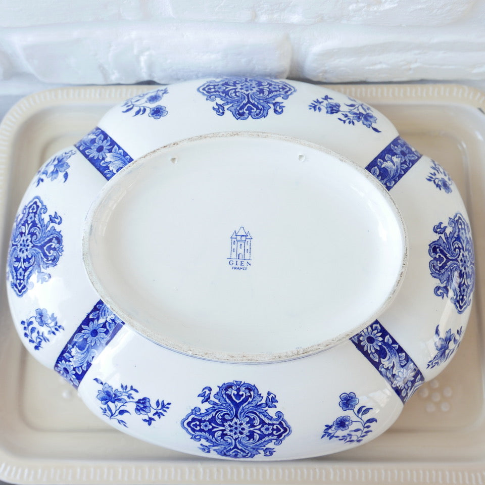 Superbe grand plat corbeille en faïence de la Manufacture de Gien, modèle Renaissance bleu, motif emblématique de la marque inspiré des majoliques italiennes et des motifs du XVIᵉ siècle.