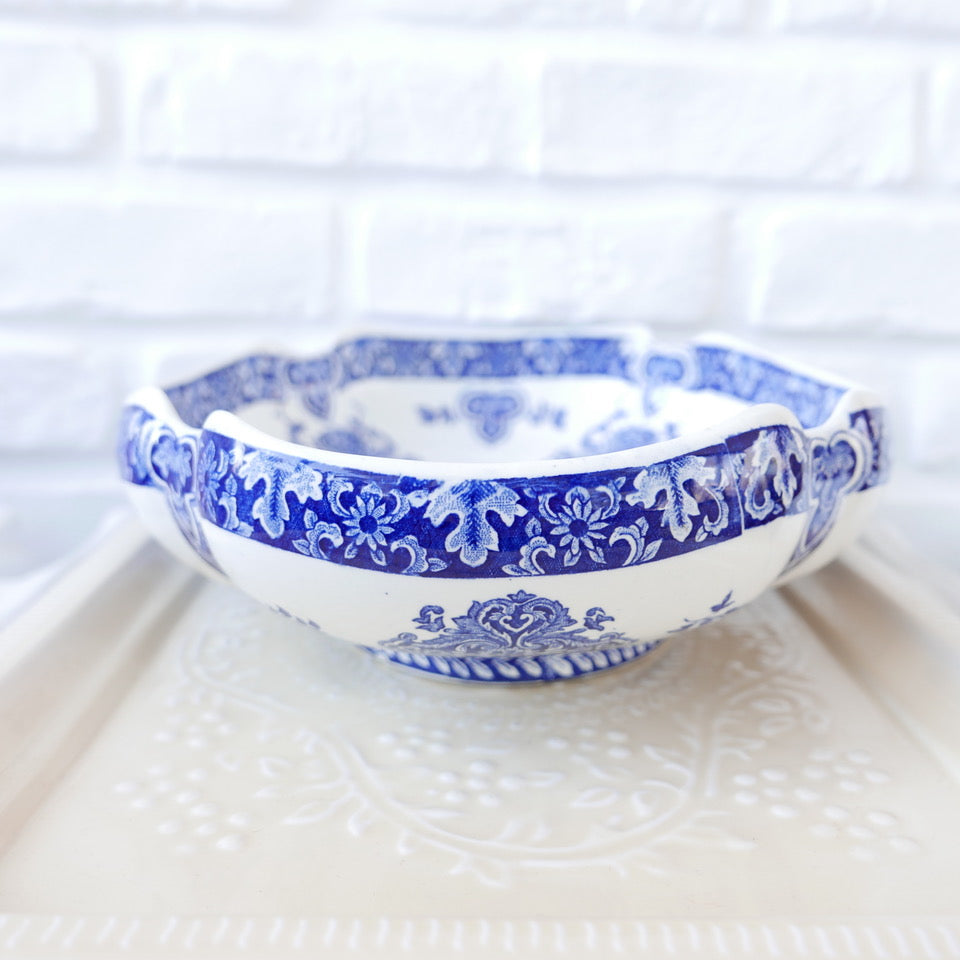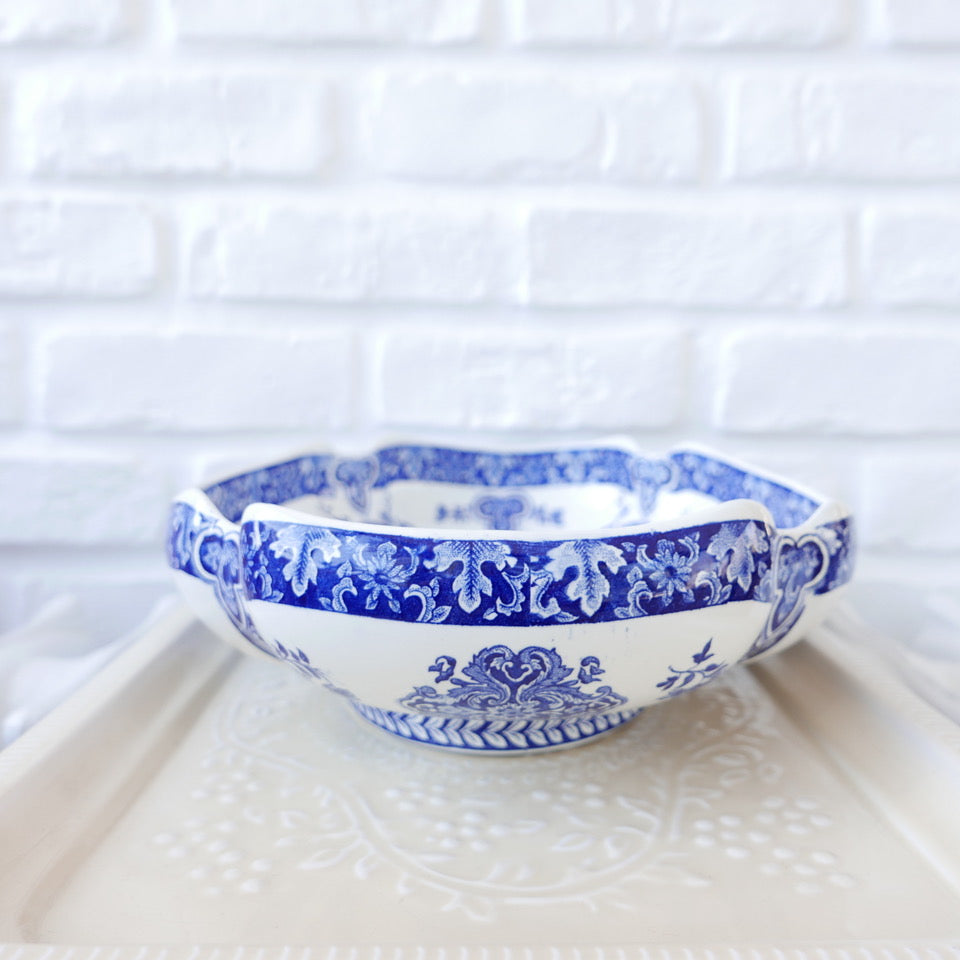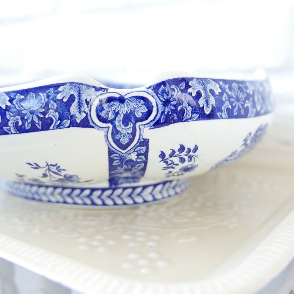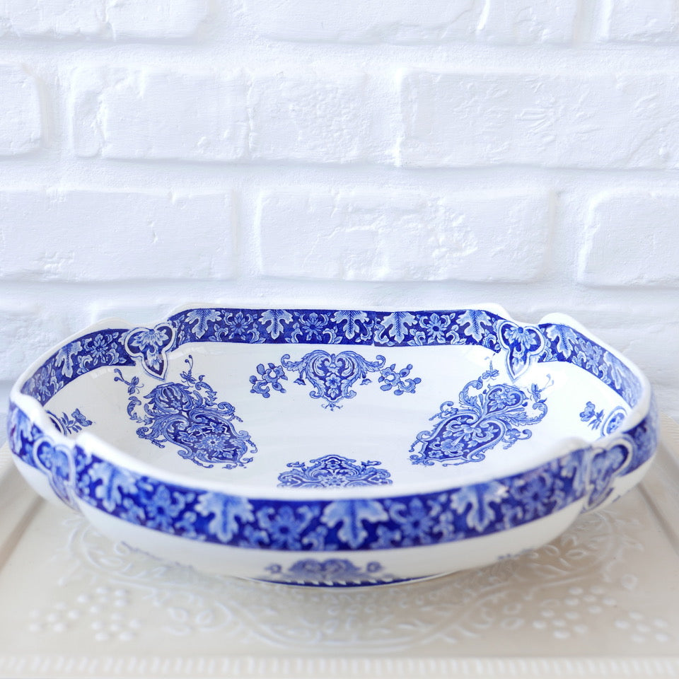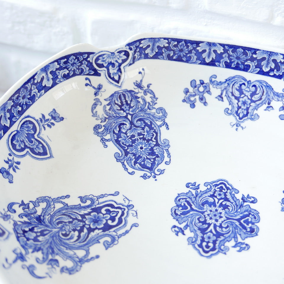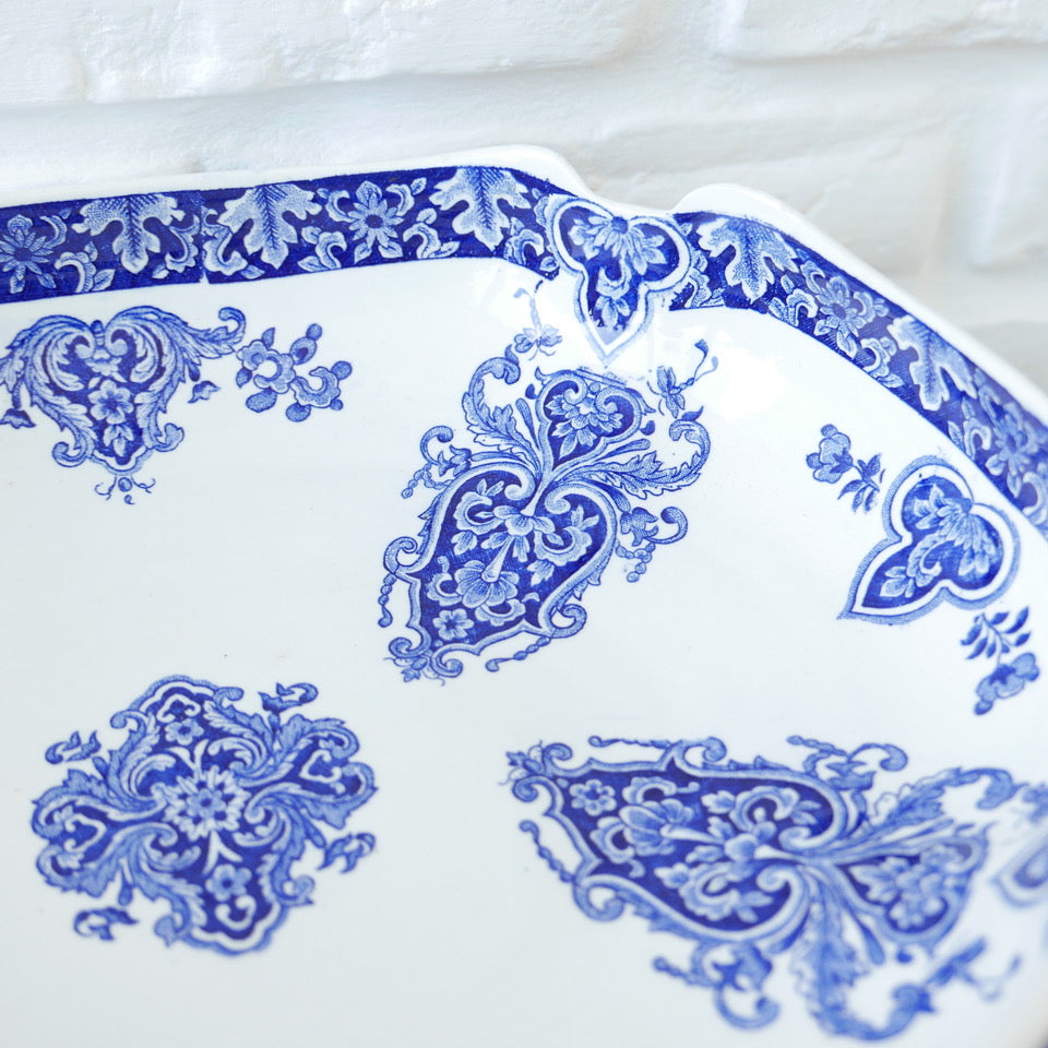 Le décor floral et ornemental peint à la main représente des arabesques et feuillages stylisés, correspondant au modèle « Renaissance » dans sa version bleue, modèle réédité notamment dans les années 1970’s- 1990’s.