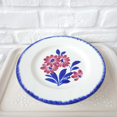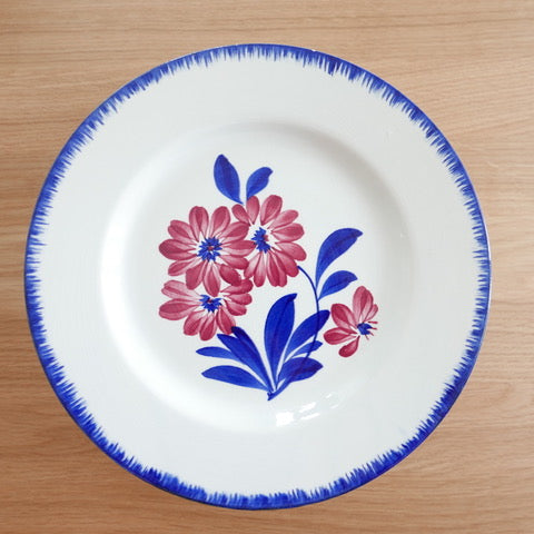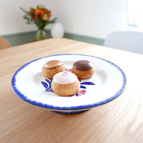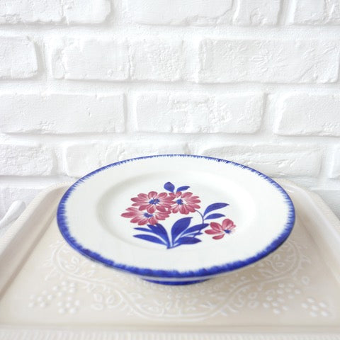 Ravissant plat serviteur ancien, ou présentoir sur piedouche, en faïence émaillée de la Manufacture de Gien, modèle Cancale, à décor floral de couleur bleu et rose framboise sur fond ivoire au centre de la coupe et datant de la fin du 19ème siècle – début du 20ème (entre 1886 et 1938 d’après l’estampille sous la base).