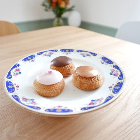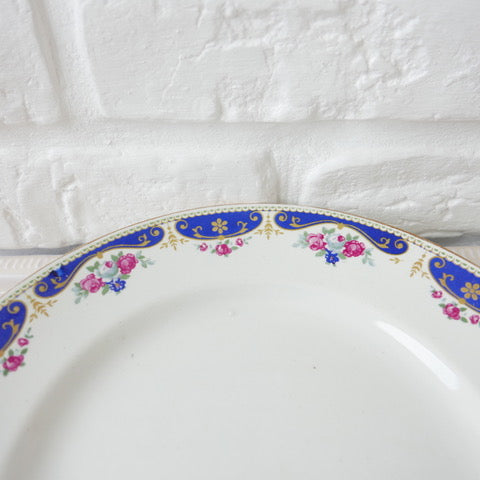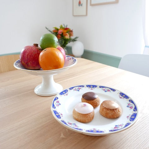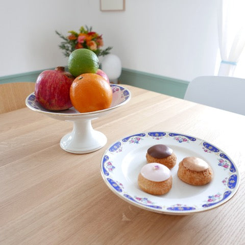 La coupe principale comme le pied sont réhaussées d’un filet doré qui s’accorde à merveille avec le décor dentelle et floral bleu et rose.